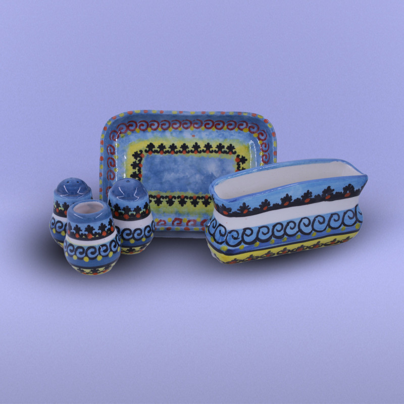 Ölçülər Salfetka qabı: Hündürlüyü: 8 sm Uzunluğu: 16 sm Duz, istiot qabları: Hündürlüyü: 7 sm Diametri: 5 sm Biskivit bişirmə temperaturu: Seramik - 1040-10500C; Porselen - 950-10200C; Qırmızı gil məmulatları - 950-10000C. Seramik və Porselen biskivitlər Nargisporcelainin şirəaltı boyaları ilə boyanıb şirlənir və bişirilir: Seramik - 1040-10500C; Porselen - 1140-11500C.